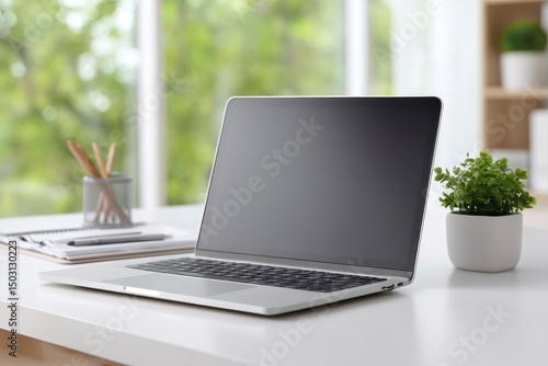 laptop, desk, workspace, office, plant, notebook, natural, light, serene, calm, peaceful, modern, minimalist, clean, bright, technology, productivity, efficiency, work, home, computer, screen, keyboard, white, grey, silver, green, pot, simple, elegant, aesthetic, background, style, design, image, photo, commercial, product, digital, hardware, software