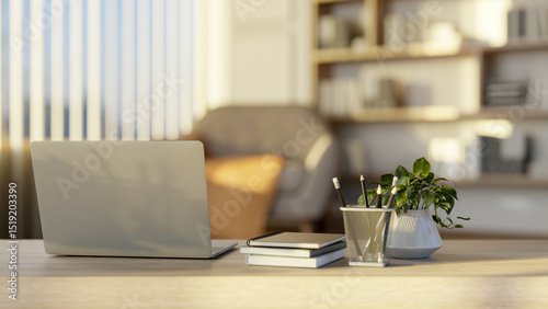 three-dimensional, rendering, illustration, indoor, no people, modern, house, home, condo, apartment, residence, studio, room, furniture, living room, door, wall, daytime, white, clean, blank, empty, wooden, table, desk, sofa, couch, cushion, pillow, floor, working, laptop, plant, pot, stationary, book, bookshelf, glasses