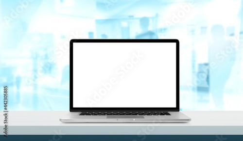 Laptop or notebook with blank screen on hospital service counter in blurry background with operating room or examination room for banner or wallpaper healthcare and medical.
