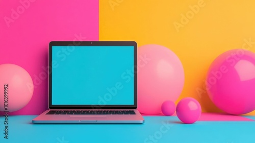 technology, laptop, screen, digital, creative, design, abstract, shape, colourful, business, concept, studio, modern, minimalist, workspace, office, device, computer, art, graphic, vibrant, background, display, equipment, innovation, product, work, style, casual attire, bright, colours, geometric, three-dimensional, render, creativity, productivity, digital artwork, graphic design, color palette, minimalism, advertising