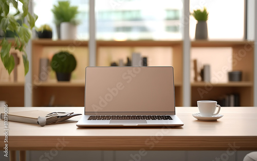 Laptop with blank screen, coffee cup and flowers on wooden table