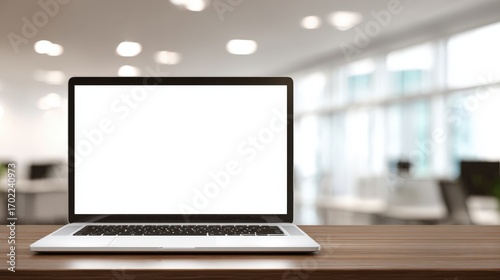 Laptop with Blank Screen on Wooden Desk in Modern Office Environment, Mockup for Design