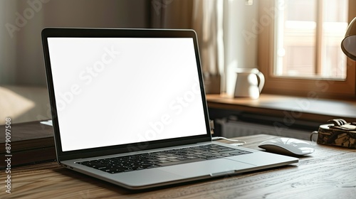 Laptop with blank white screen on wooden desk, mouse beside, ready for your content