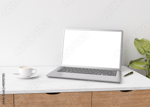 Laptop with blank white screen on wooden table at home or in office. Computer mockup. Free space for app, game, web site presentation. Cozy interior with white wall, cup of coffee, plant. 3D rendering