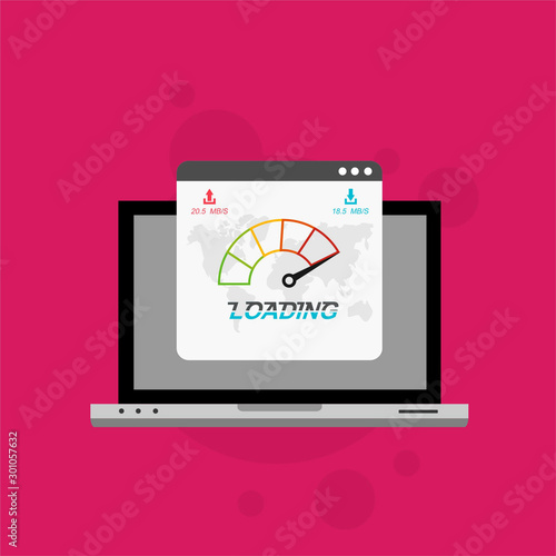 Laptop with speed test on the screen. Flat design people and technology concept. Vector illustration for web banner, business presentation, advertising material.