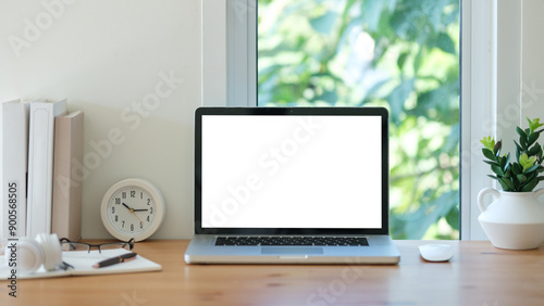 Laptop with white blank screen, books, coffee cup and headphone on wooden table.