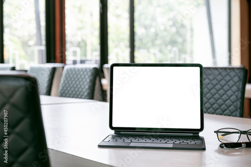 Laptop with white blank screen on wooden table in dark modern meeting room.