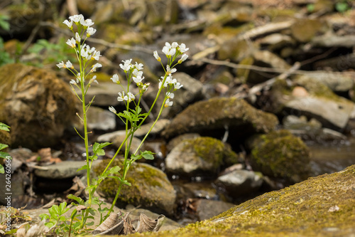 Large bittercress (Cardamine amara). A beautiful plant blooms over a mountain stream. Bieszczady Mountains. Poland