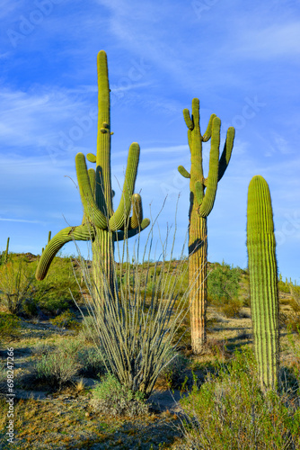Large cacti in Arizona against a blue sky, desert landscape. Saguaro Cactuses (Carnegiea gigantea) in desert