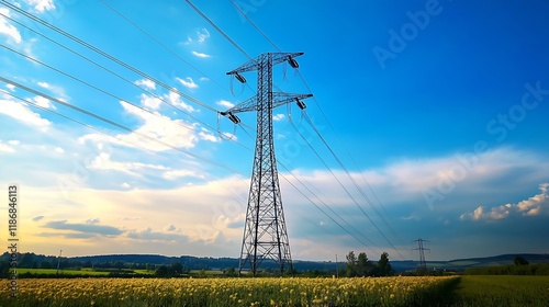 Large Electrical Transmission Tower in Rural Landscape Under Blue Sky : Generative AI