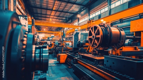 factory, industry, machine, equipment, production, manufacturing, metal, steel, workshop, warehouse, facility, engineering, construction, assembly, processing, technology, automation, building, interior, space, structure, framework, support, beam, ceiling, roof, light, colours, orange, blue, industrial, gear, wheel, cog, heavy, tool, detail, sharpened, perspective, long, large, wide, complex, bright, vibrant, clean, modern
