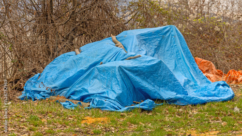 Large Heap of Stuff Hidden Under Blue Tarp Cover in Yard Garden