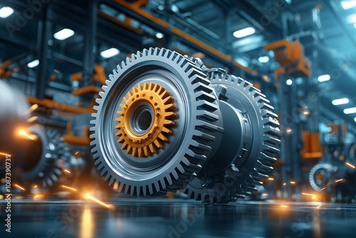 Large industrial gears and heavy machinery components in a dynamic factory setting, emphasizing intricate design and powerful mechanics of modern engineering