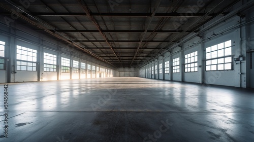 Large modern empty warehouse, photorealistic illustration. Generative art