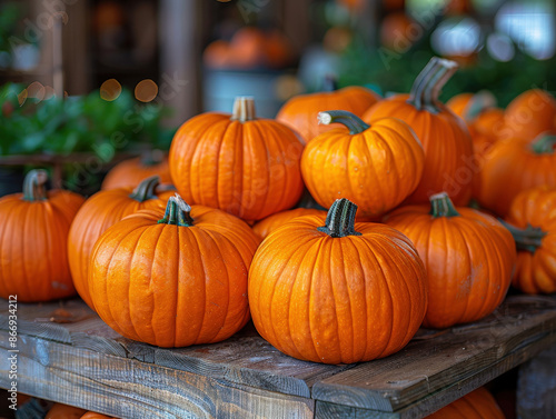 Large pile orange pumpkins stacked together, background blurred to highlight detailed textures