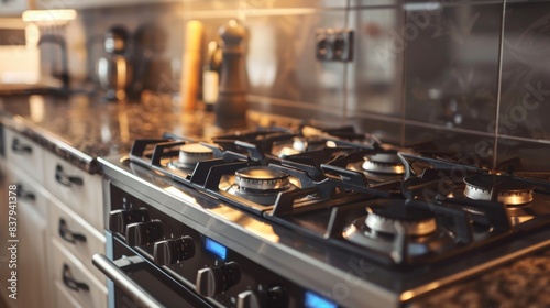 Large range style cooker in modern kitchen interior with granite worktop. Gas stove close-up. Home and cooking concept.