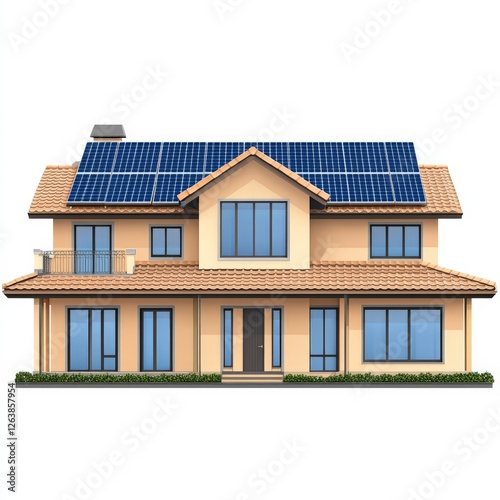 Large sustainable residential house with rooftop solar panels, representing eco conscious architecture, green energy solutions, and future housing trends