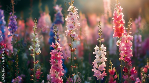 larkspur flowers close up, Afternoon time, whimsical and Idyllic nature. vibrant with high resolution photography, copy space for text banner background