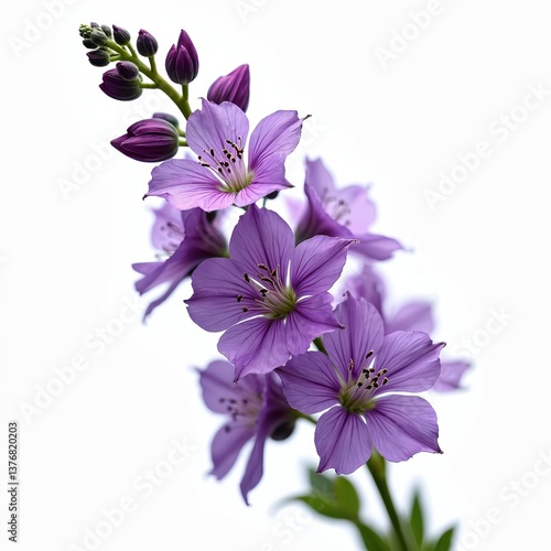 Larkspur flowers isolated on white. Delicate violet blooms, fresh, vibrant, natural beauty. Summer season, floral design element. Ideal for botanical illustrations, greeting cards, eco-friendly