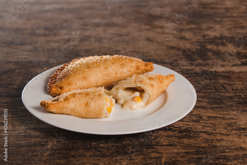 Latin American fried corn and cheese empanadas on top of a wooden table