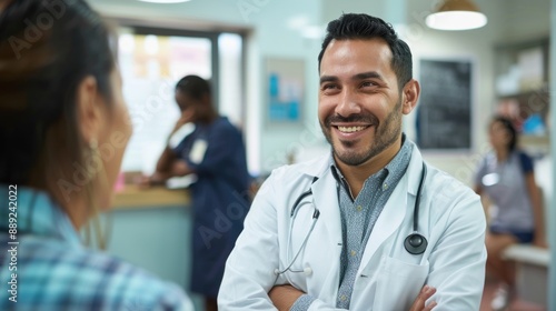 Latino physician greeting patients in the waiting room of his clinic