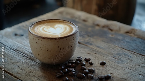 latte, hot drink, beverage, drink, coffee mug, hot beverage, morning, cafes, eatery, barista, cafes, coffee bean, foam, wooden table, rustic, image, food photography, still life, brown, beige, cream, dark brown, light, closeup, product, commercial, food, photo, photo, graphic design, creative, design, artistic, cup, high-quality