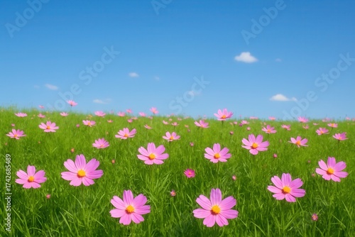 Latvia, Kandava, 2025-08-23, Latvijas kauss A vibrant field of pink cosmos flowers under a clear blue sky, symbolizing joy and tranquility