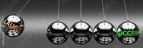 Laugh and success - the idea that Laugh helps to achieve success and happiness in business, work and life symbolized by English word Laugh and a newton cradle, 3d illustration