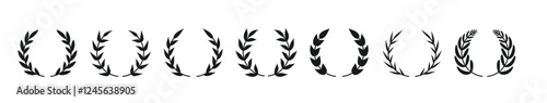 Laurel wreath icon set. Сollection of black circular foliate laurels branches. Vintage laurel wreaths. Black silhouette circular laurel foliate, wheat and oak wreaths depicting an award, achievement.