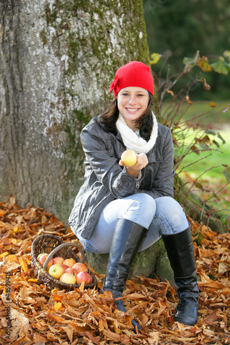 girl, young, teenage, apple, pannier, gathering, plucking, brown-haired, caucasian, cute, pretty, woman, healthy, health, feeding, food, needful, well-being, relax, peaceful, relax, zen, rest, autumn, season, bonnet, foulard, leaf, orange, cold, smile, action, shaft, happy, luck, outside, seated