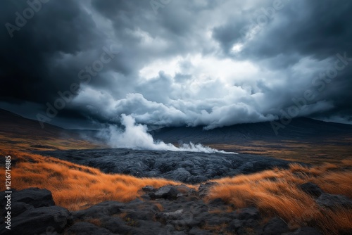 Lava field glows under dramatic skies with steam rising from the earth in a breathtaking volcanic landscape. Generative AI