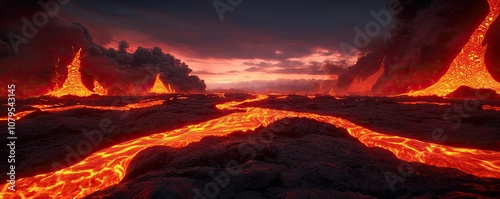 Lava flow from volcano, dramatic sunset sky, captivating natural landscape.