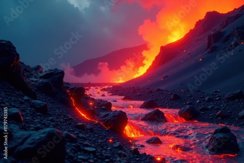 Lava flows down volcanic slope, fiery red glow, eruption, panoramic