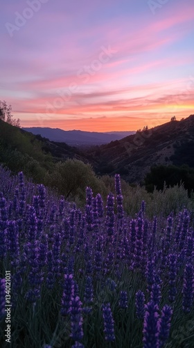 Lavender blooms beneath a painted sunset over rolling hills and valleys