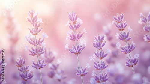 Lavender blooms flourish against a soft lavender gradient blending seamlessly into a pale pink background, capturing the essence of a serene summer day in a flower garden
