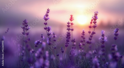 Lavender Field at Sunrise With Soft Fog and Gentle Light