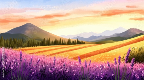 lavandula, field, sunset, mountain, hill, vale, pixel, art, digital, landscape, nature, gold, orange, pink, purple, blue, sky, tree, forest, rural, idylli, peaceful, calm, golden hour, vibrant, colours, pastel, geometric, artistic, view, horizon, summer, spring, beautiful, scenic, nature scene, pixelated, illustration, fantasy, warm colors