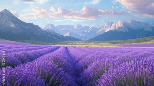 Lavender field at sunset, with vibrant purple flowers stretching toward majestic snow-capped mountains in distance. The scenic landscape tranquility, natural beauty charm of rural life. Generative AI