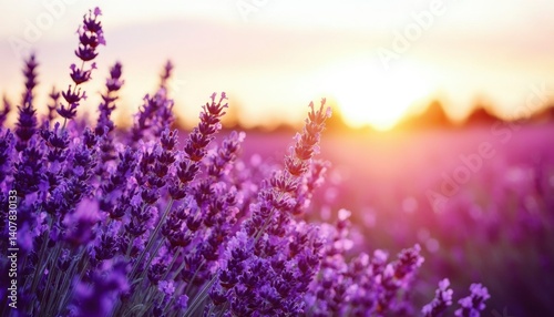 Lavender field blooming at sunset, golden light, peaceful rural landscape