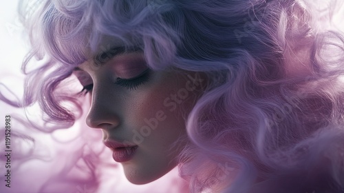 woman, girl, female, portrait, face, profile, hair, lavandula, purple, lilac, pink, curl, wavy, make-up, eye, closed, eyelash, skin, soft, gentle, serene, calm, peaceful, beauty, model, fashion, style, aesthetic, dreamy, delicate, romantic, aethereal, mystic, elegant, sophisticated, vogue, glamour, artistic, image, photo, picture, art