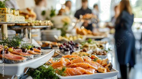 buffet, appetiser, food, salmon, cheese, event, celebration, catering, delicious, variety, display, presentation, indoor, table, arrangement, elegance, party, gathering, cookery, fine dining, epicure, olive, dill, grape, bread