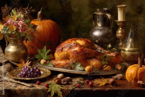Lavish Thanksgiving still life with roasted turkey, pumpkins, and autumn leaves on rustic table for holiday campaigns, gourmet packaging, and seasonal home decor