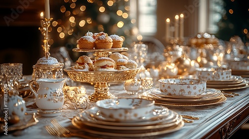 Lavishly set Victorian-style Christmas dining table featuring golden accents vibrant desserts and elegant tableware