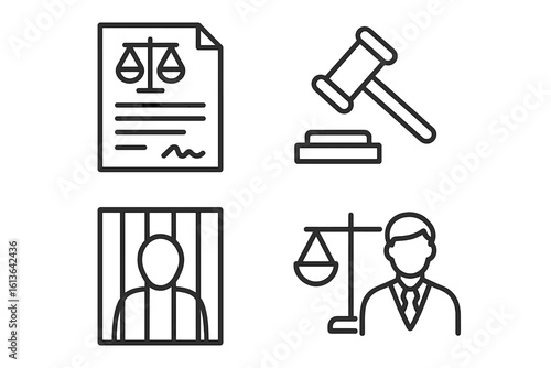 law, justice, icon, legal, court, judge, lawyer, gaol, gavel, crime, punishment, document, verdict, trial, scale, vector, symbol, lawyer, advocate, condemned, gaol, conviction, case, evidence, balance, judiciary, criminal, lawsuit, legislation, equality, human, right, police, rule, authority, government, line, outline, illustration, pictogram, set