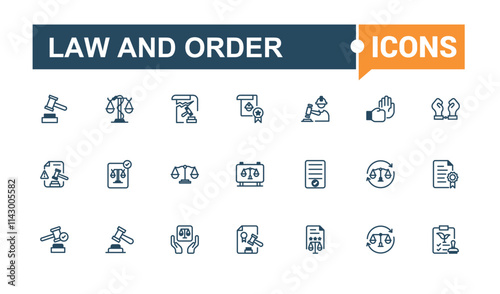 Law and Order icon set. Icon authority, graphic, judge, justice, judgement, hand, web, police. Flat UI icon design. Editable vector outline and solid icons.