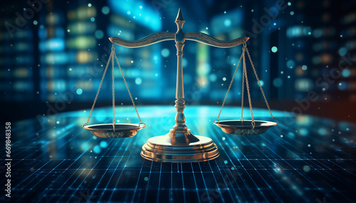 Law scales on background of data center. Digital law concept of duality of Judiciary, Jurisprudence and Justice and data in the modern world