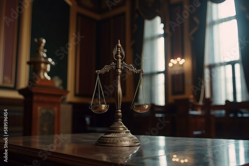 Law theme, mallet of judge, wooden desk with scales of justice, Generative Ai