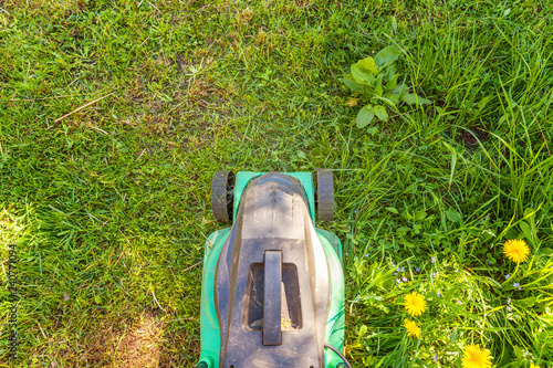Lawn mower cutting green grass in backyard in sunny day. Gardening country lifestyle background. Beautiful view on fresh green grass lawn in sunlight, garden landscape in spring or summer season
