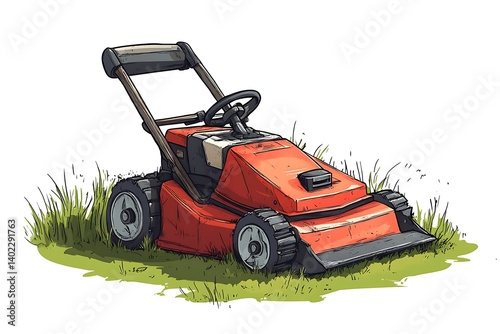 lawn mower, grass, garden, yard, equipment, red, machine, tool, illustration, cartoon, drawing, retro, vintage, maintenance, care, summer, spring, nature, farming, agriculture, landscape, vehicle, power, engine, wheel, handle, cutting, mowing, exterior, design, simple, detailed, vignetting, artistic, lawn