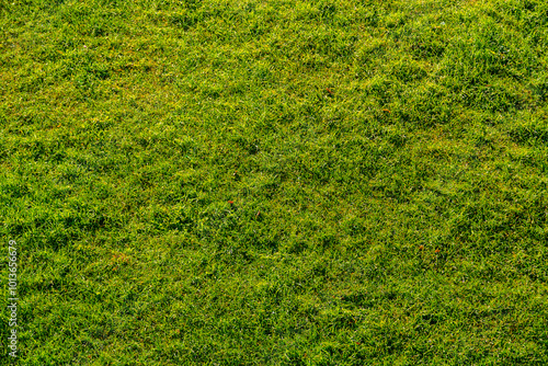 Lawn seeded with even trimmed green grass texture